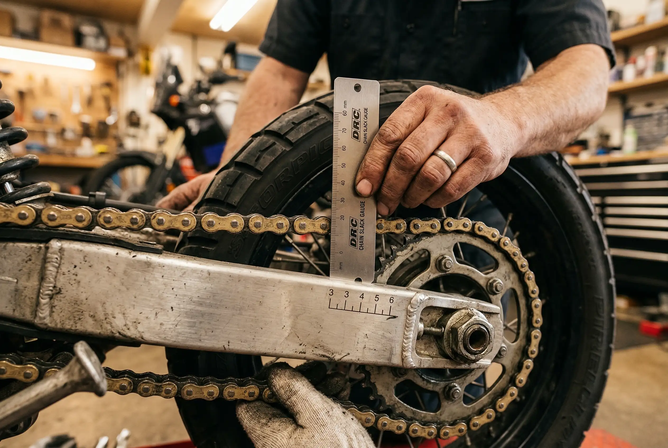 How to measure: At that midpoint, push the chain down to its lowest point with one finger. Then push it up to its highest point. The vertical distance between those two positions is your motorcycle chain slack. A simple ruler against the swingarm works fine.